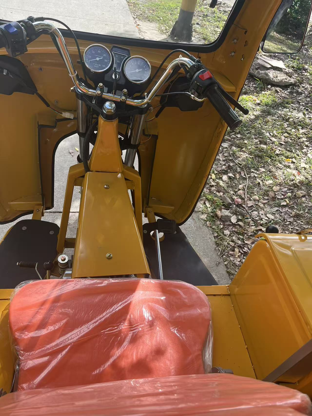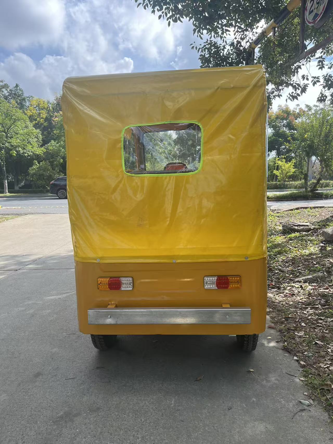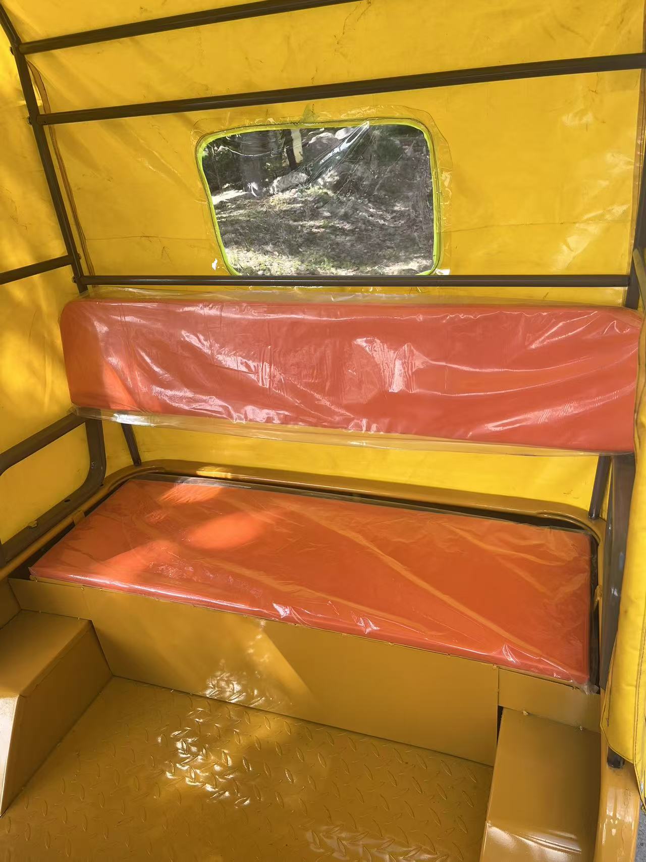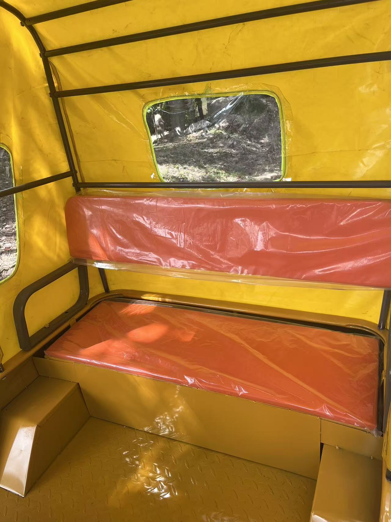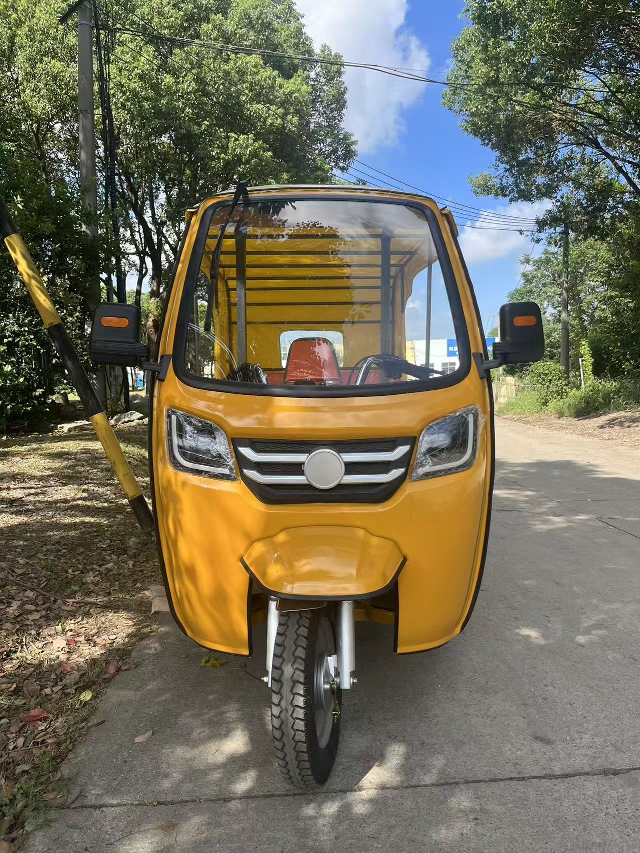 Трехколесный велосипед с передним навесом, мягким навесом, двухрядные сиденья.