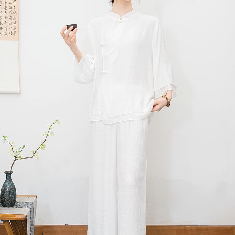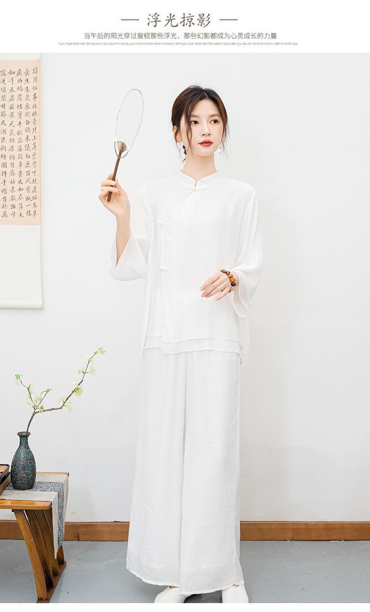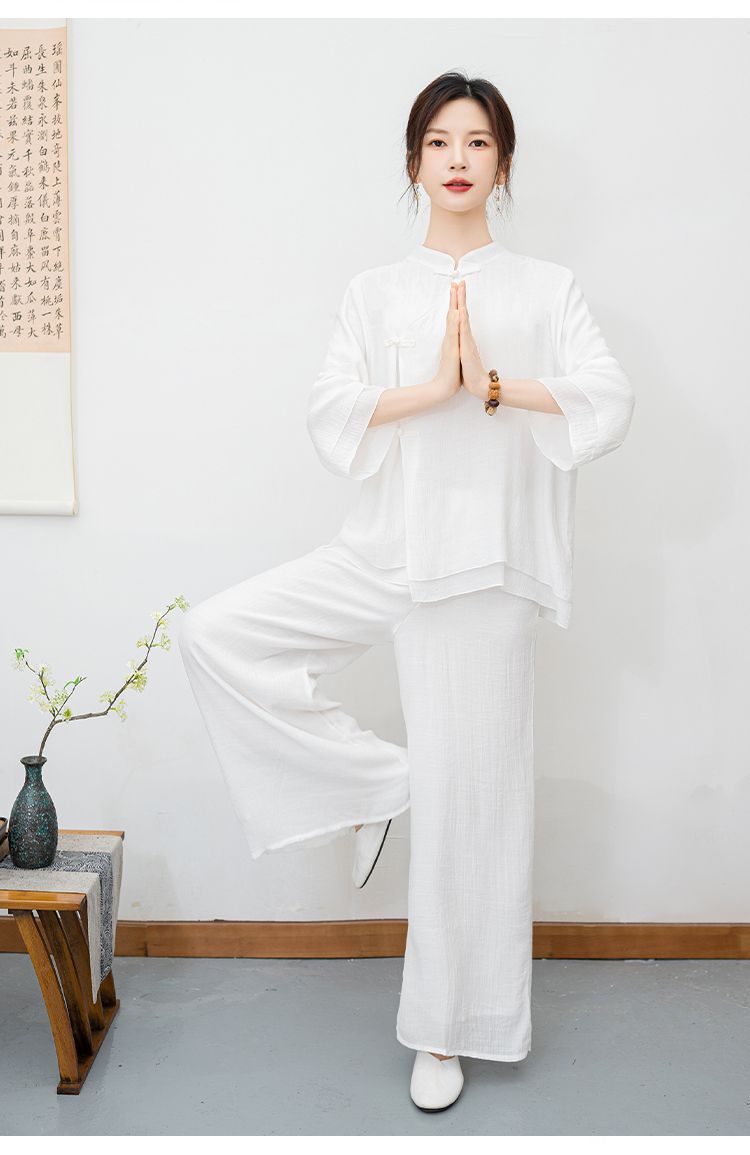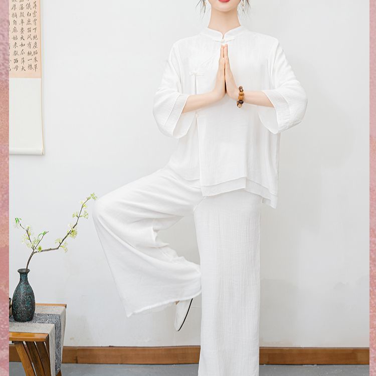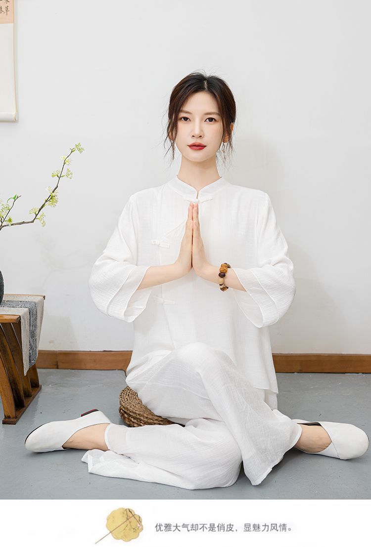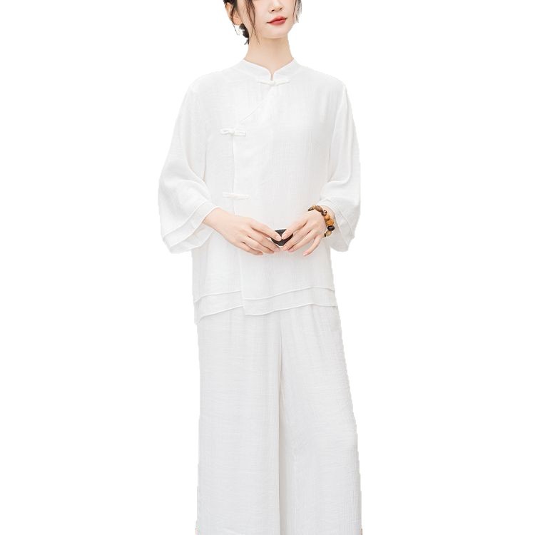 白色民族风练功服女复古禅意打坐居士服套装新中式佛系禅舞服茶服