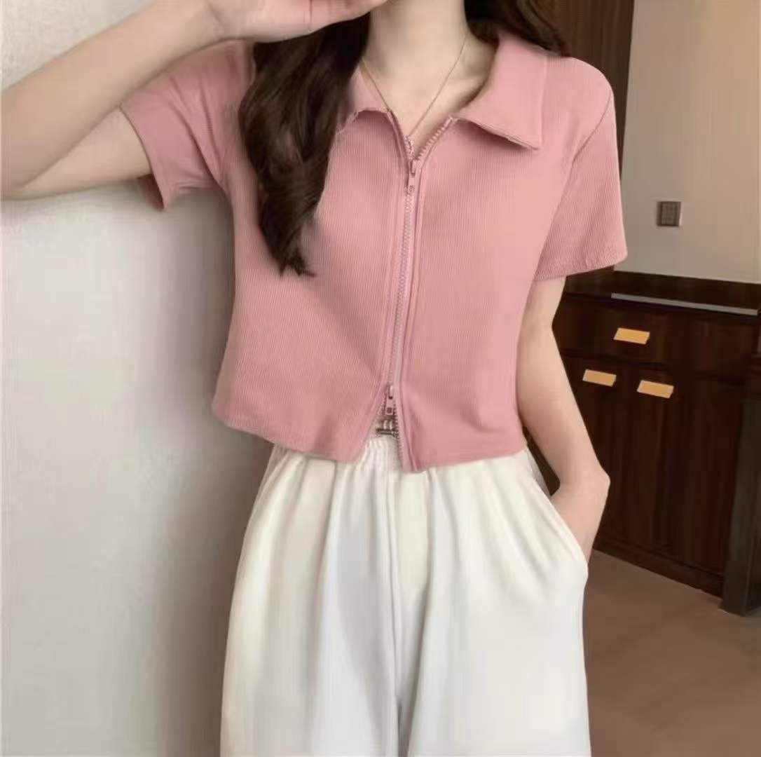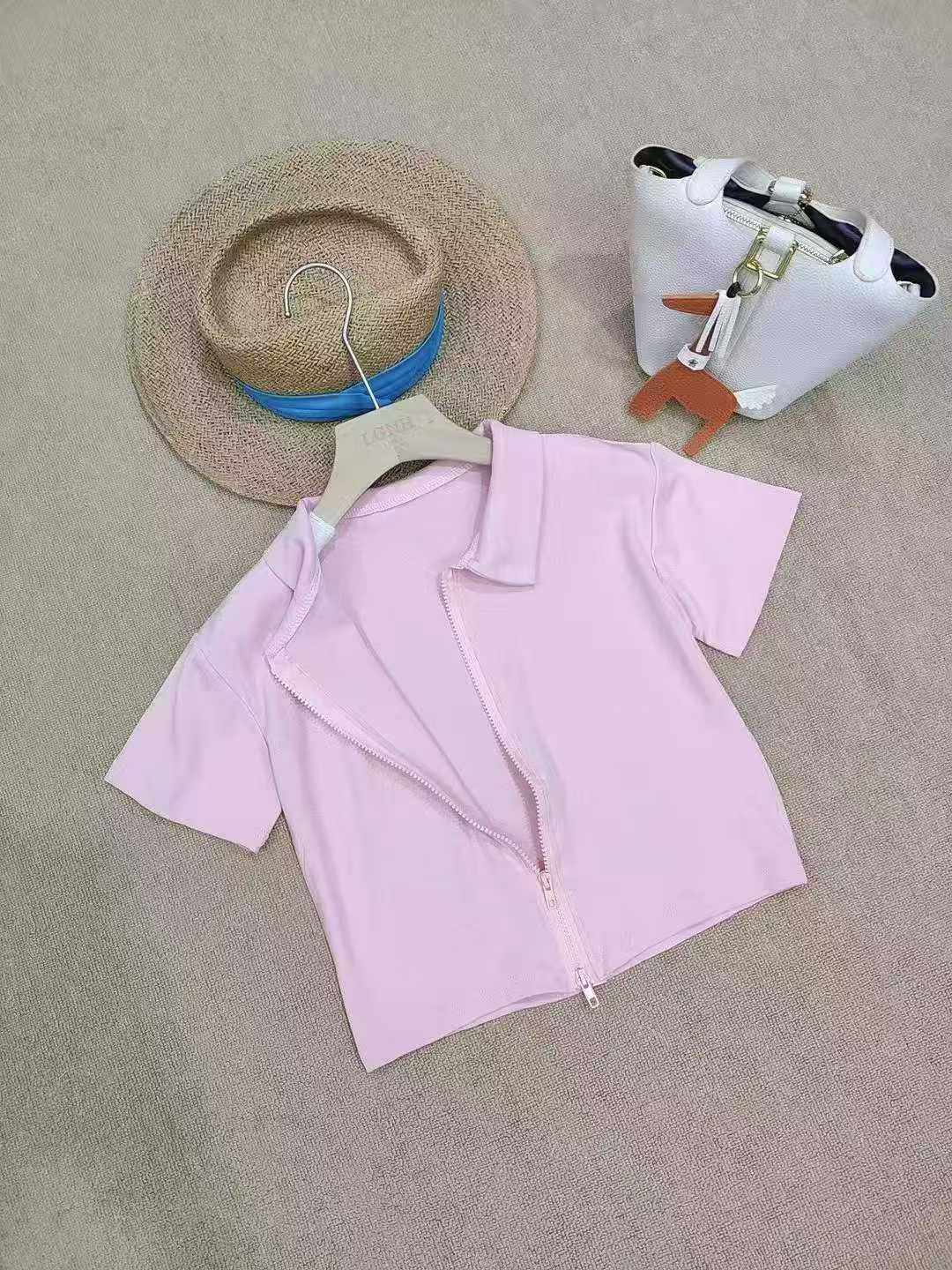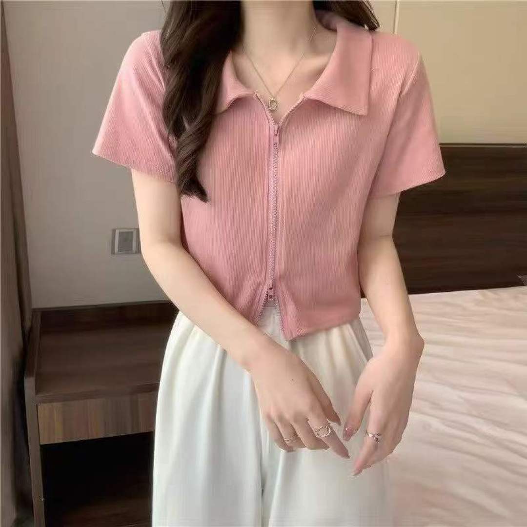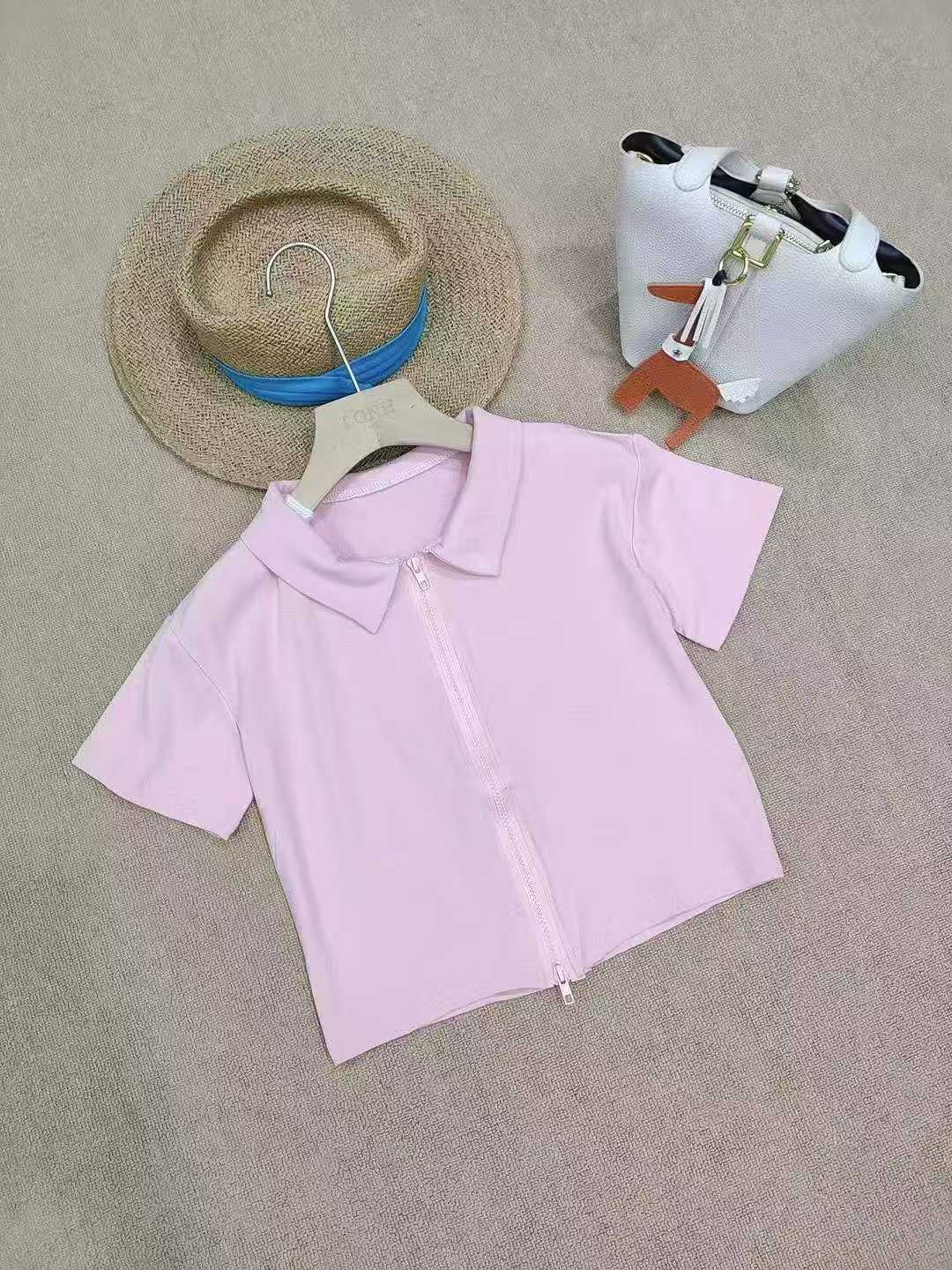 [Луна]: 5.5.9 Очистить 105 шт. (без разделения) [Луна]: розовый Polo воротник с двумя молниями короткие рукава горячая девушка хлопчатобумажная блузка [Луна]: монохроматическое качество ️
