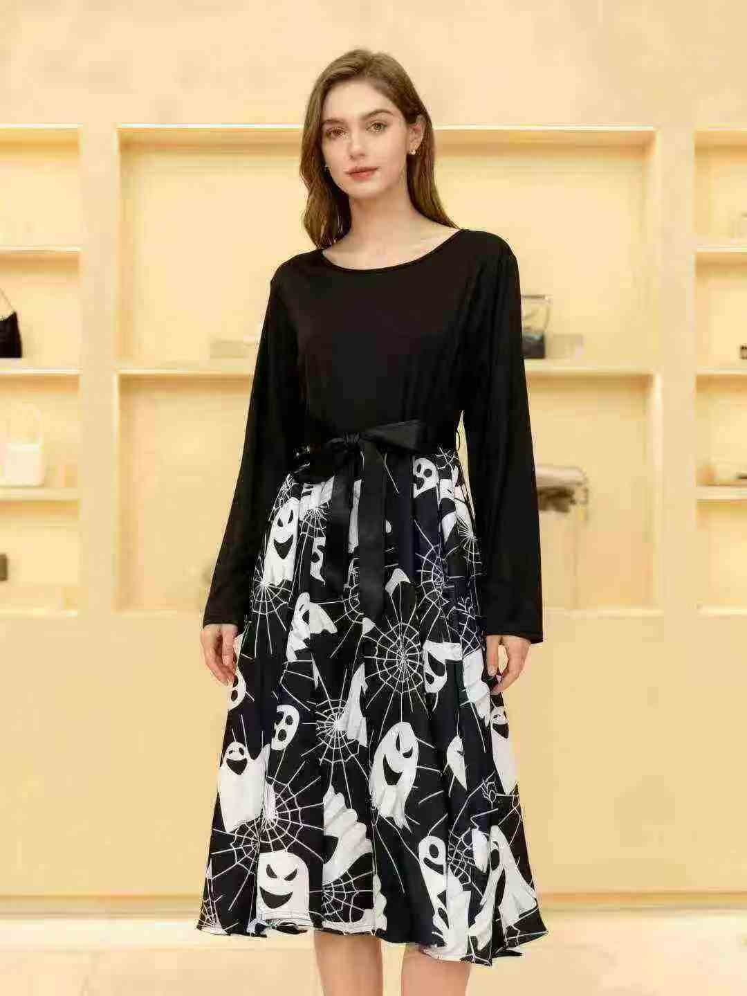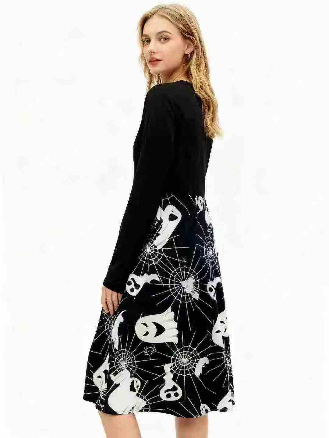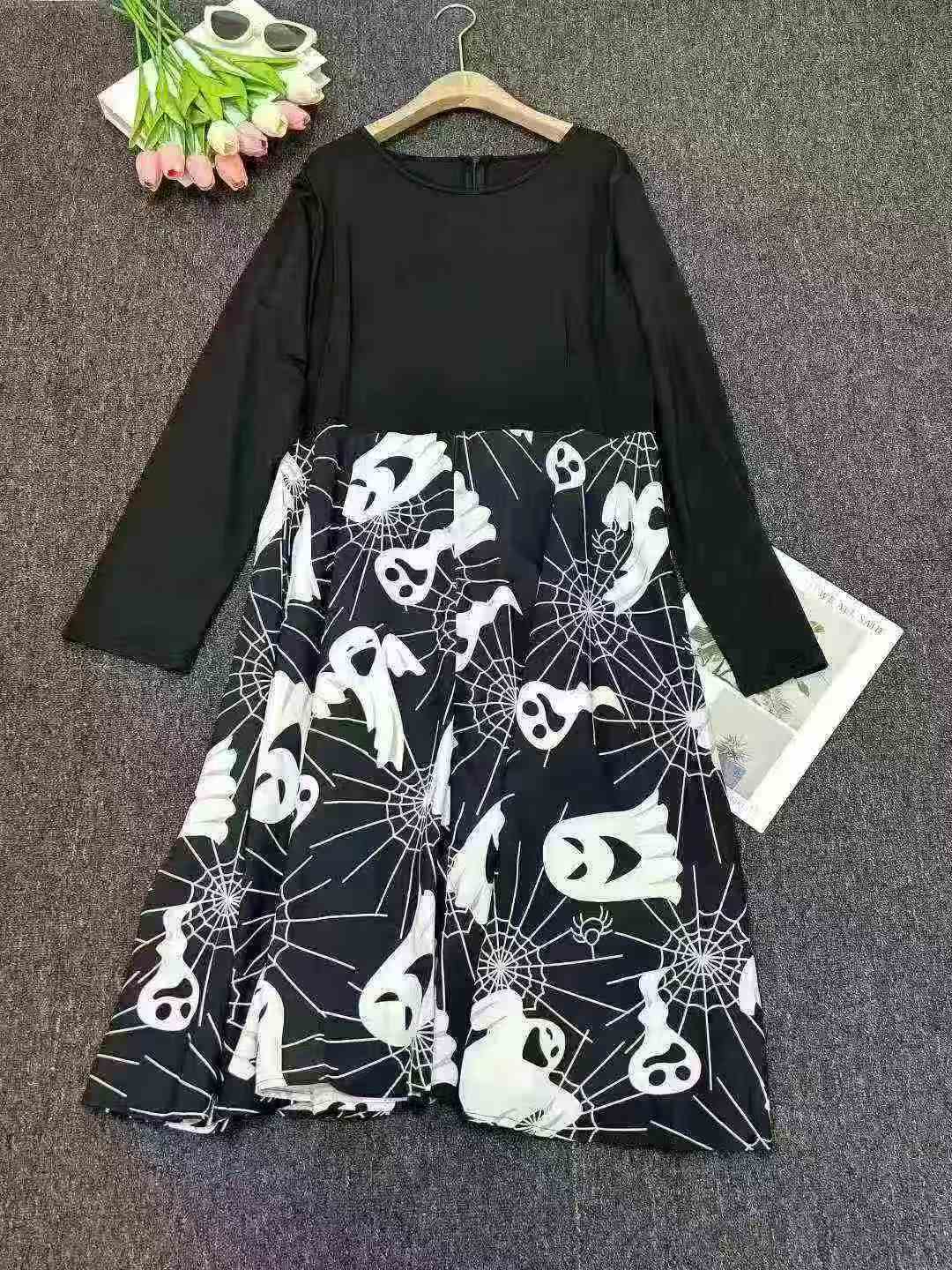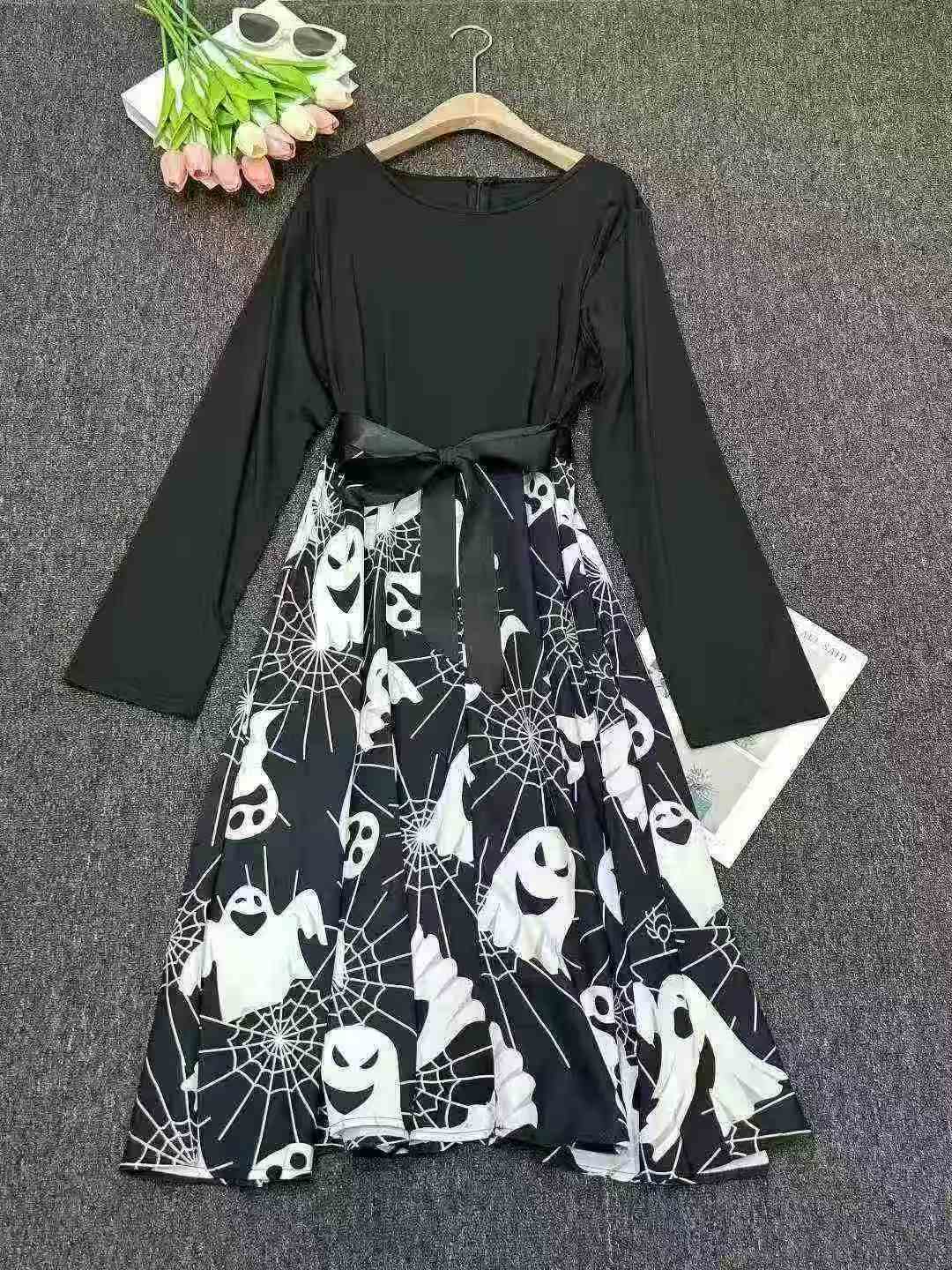 Трансграничная электронная коммерция Хепберн ретро Хэллоуин печать с длинными рукавами платье с большим маятником лента, независимая упаковка молнии, 410 штук, XL-4XL, Полностью 8.8