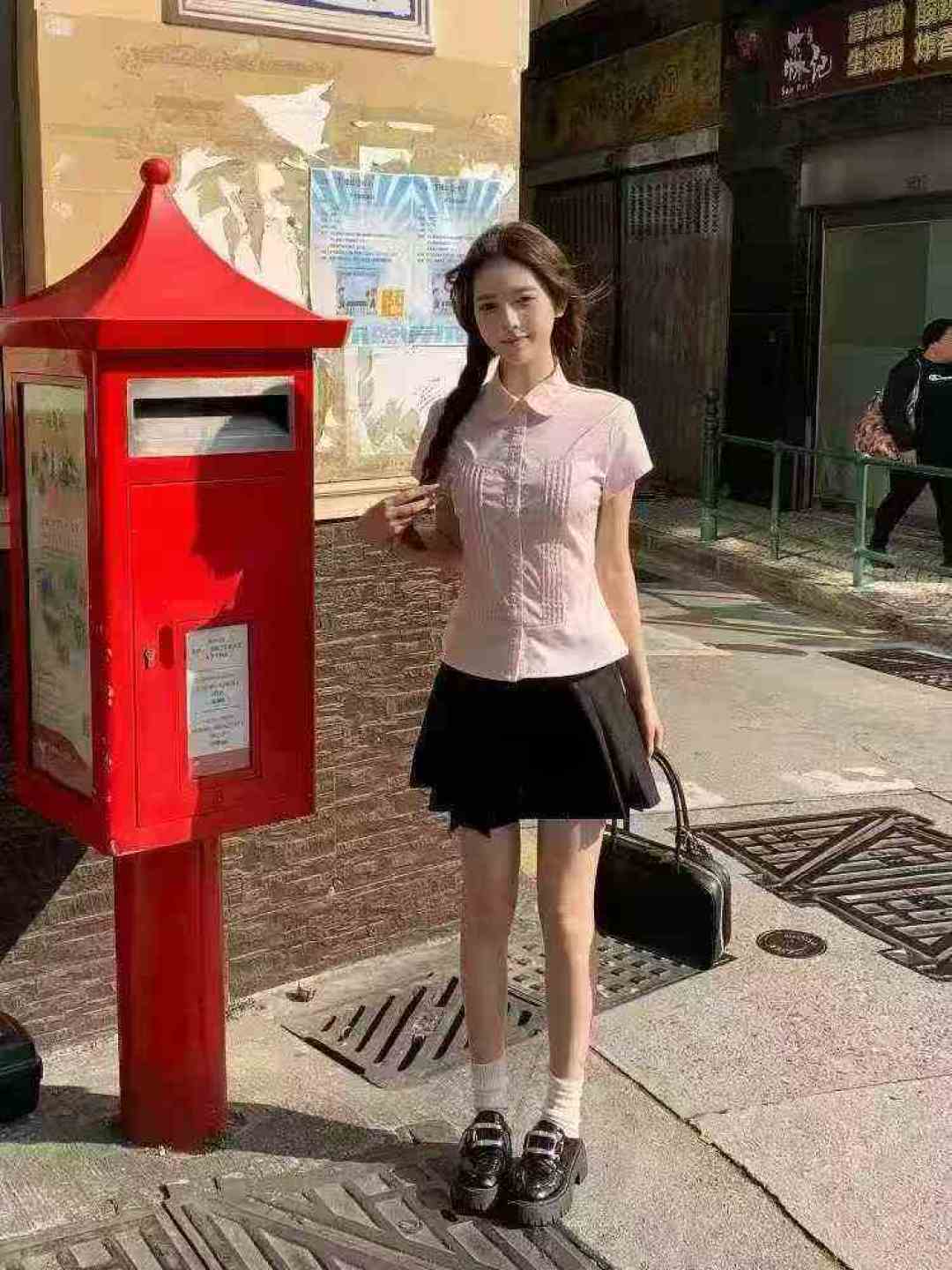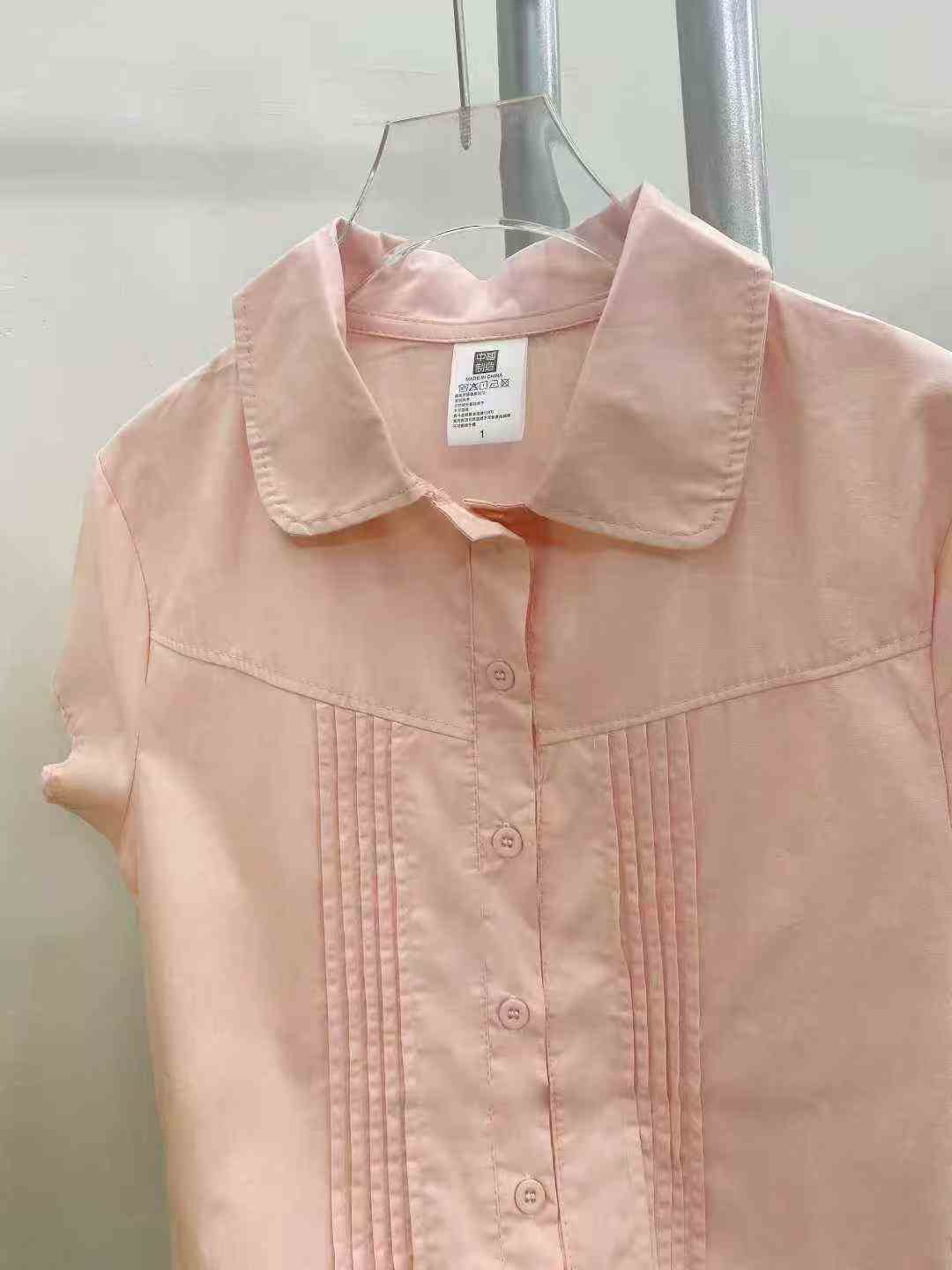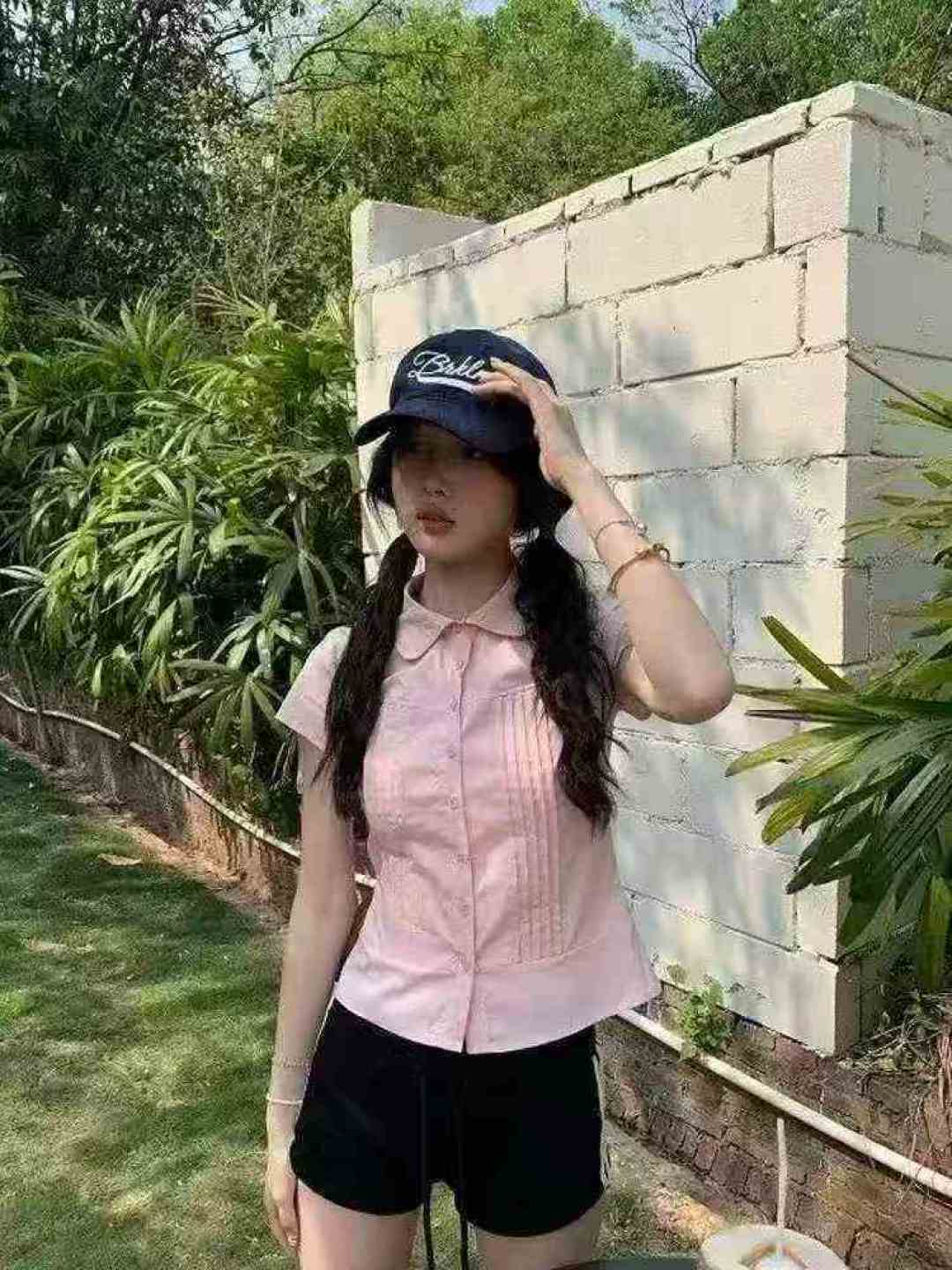 Корейская серия Сладкая розовая рубашка с короткими рукавами 595 шт. 7.8, кукольный воротник, дизайн складок, задний воротник к плечу, качество, кодовое число 1 - 4 ярда (S - XL), отдельная упаковка