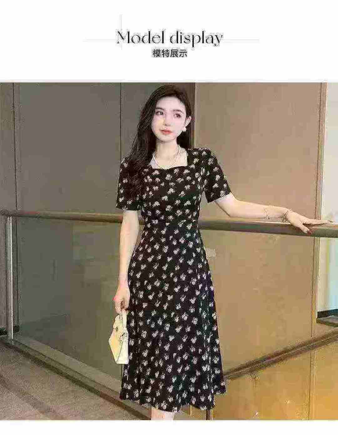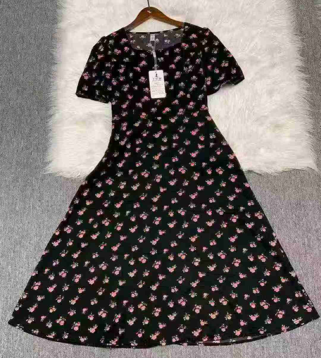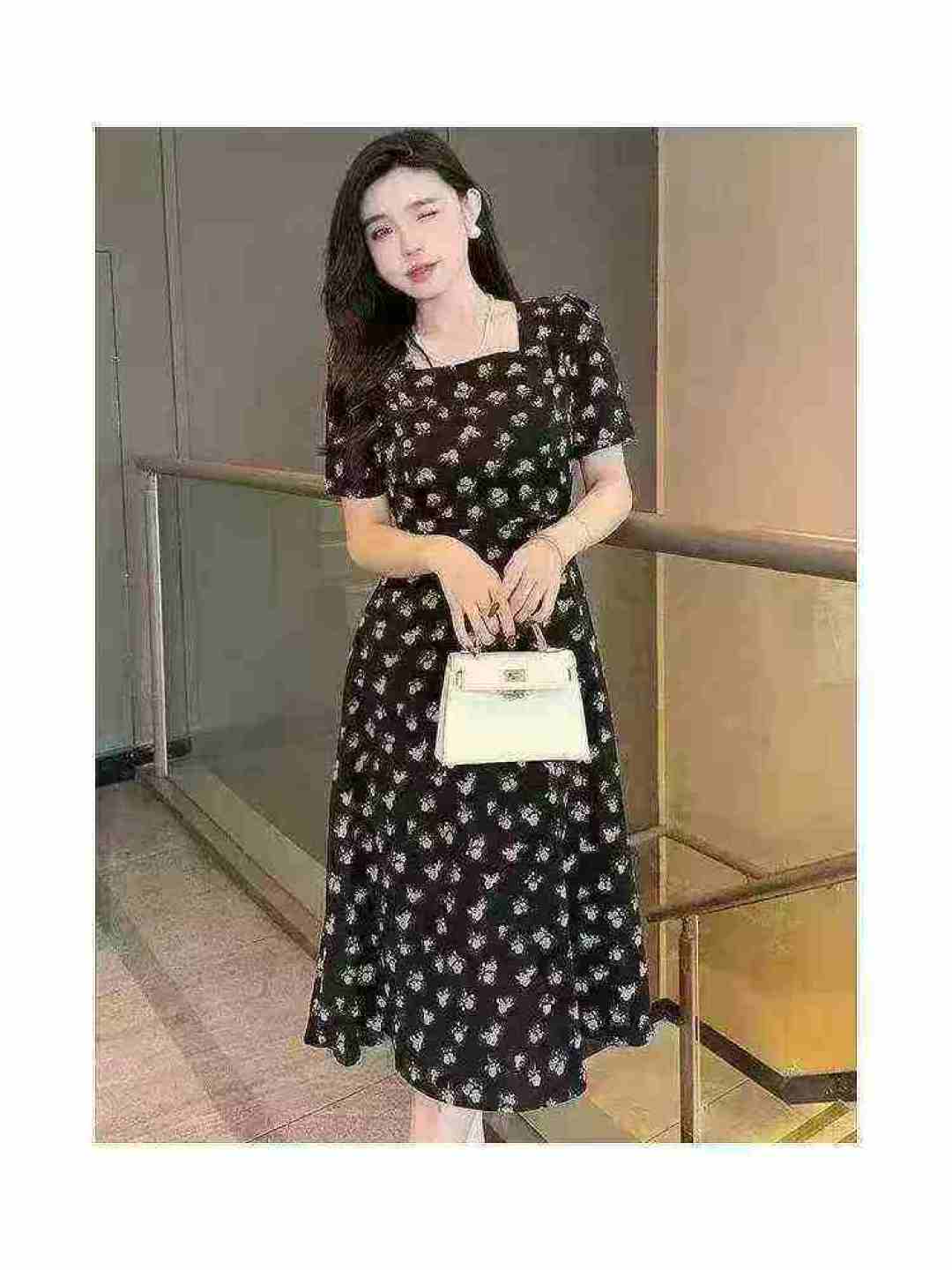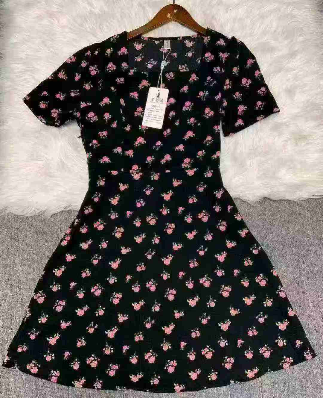 Женское платье с нарезанными цветами Новый женский длинный летний ремонт тонкий квадратный воротник с короткими рукавами маленькое черное платье французское платье с талией 260 шт., отдельная упаковка с подвеской, размер S - 3XL товары чистые и аккуратные, полная чистая цена 10,8 юаней