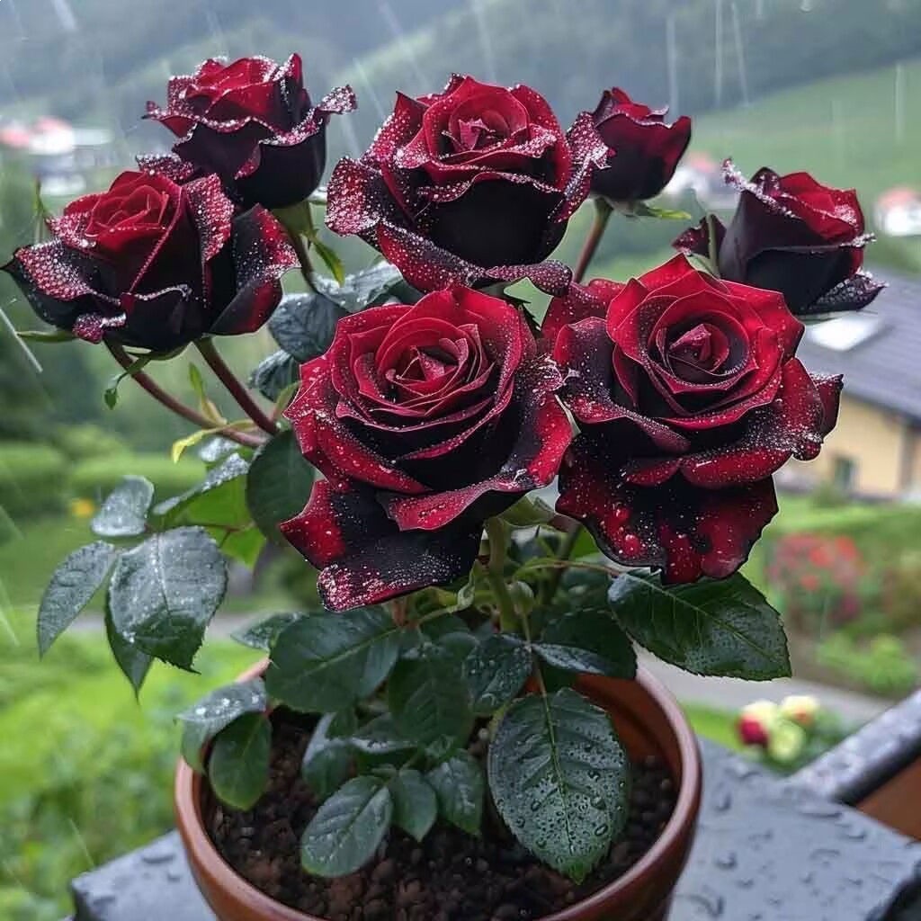 На балконе цветут цветы, густые саженцы, густой аромат, старый кол, четыре сезона розы, цветы, подлинный Бак, черный, красный.