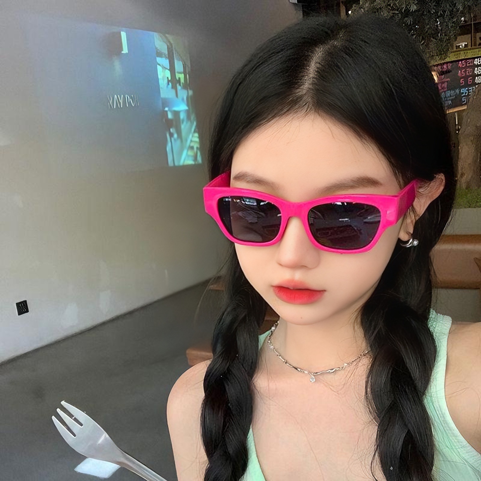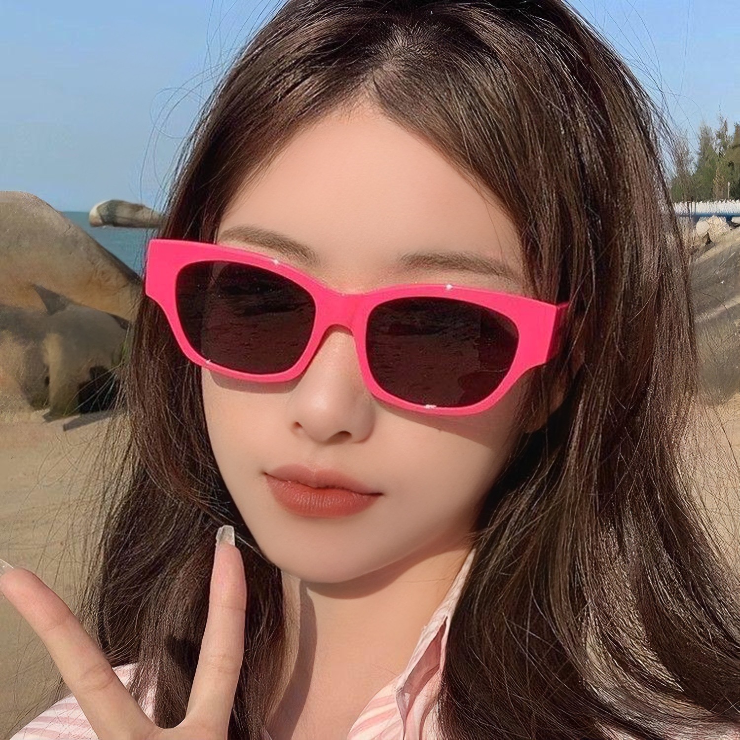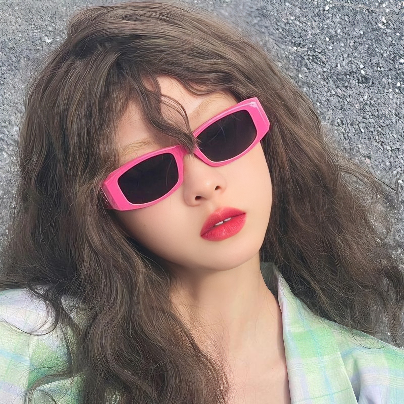 Розовые квадратные солнцезащитные очки Сеть красные Высокое чувство ins Модные вогнутые формы Пляжные зеркала Летние ультрафиолетовые фотографии